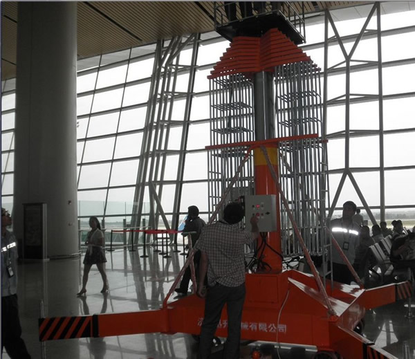 套缸式升降平臺具有設(shè)計新穎,體積小,外型美觀,操作維修方便,升降平穩(wěn)等優(yōu)點。整機(jī)由平臺、伸縮油缸、單梯式或雙梯式防轉(zhuǎn)機(jī)構(gòu)、底盤油箱、支腿、行走輪等組成。平臺由伸縮油缸直接頂升,當(dāng)啟動電機(jī)時,由電機(jī)帶動齒輪泵供油,油液經(jīng)單向閥及電磁通道輸入油缸,伸縮油缸則逐節(jié)上升,當(dāng)平臺升到最大高度時,系統(tǒng)壓力也就達(dá)到了額定工作壓力。